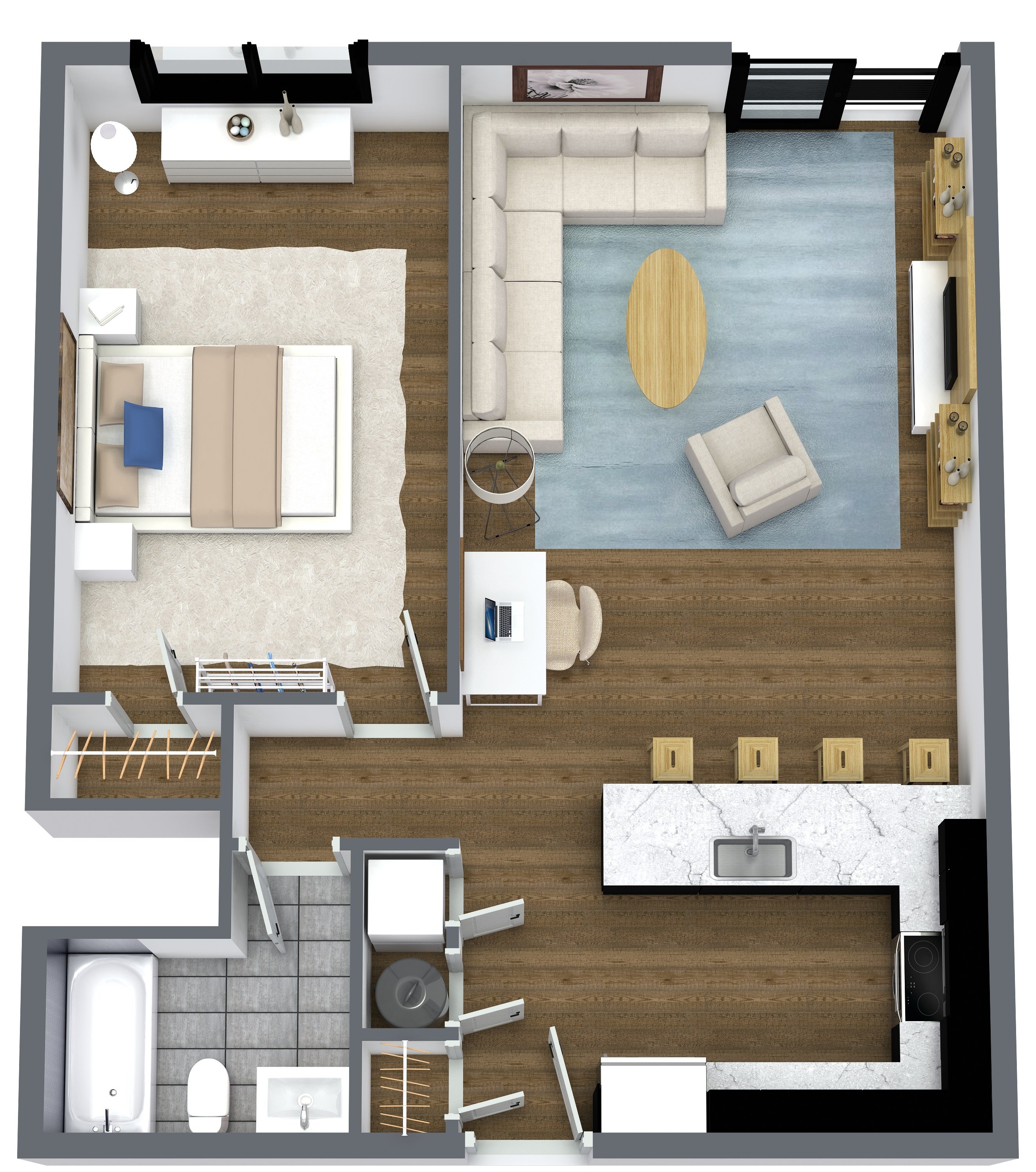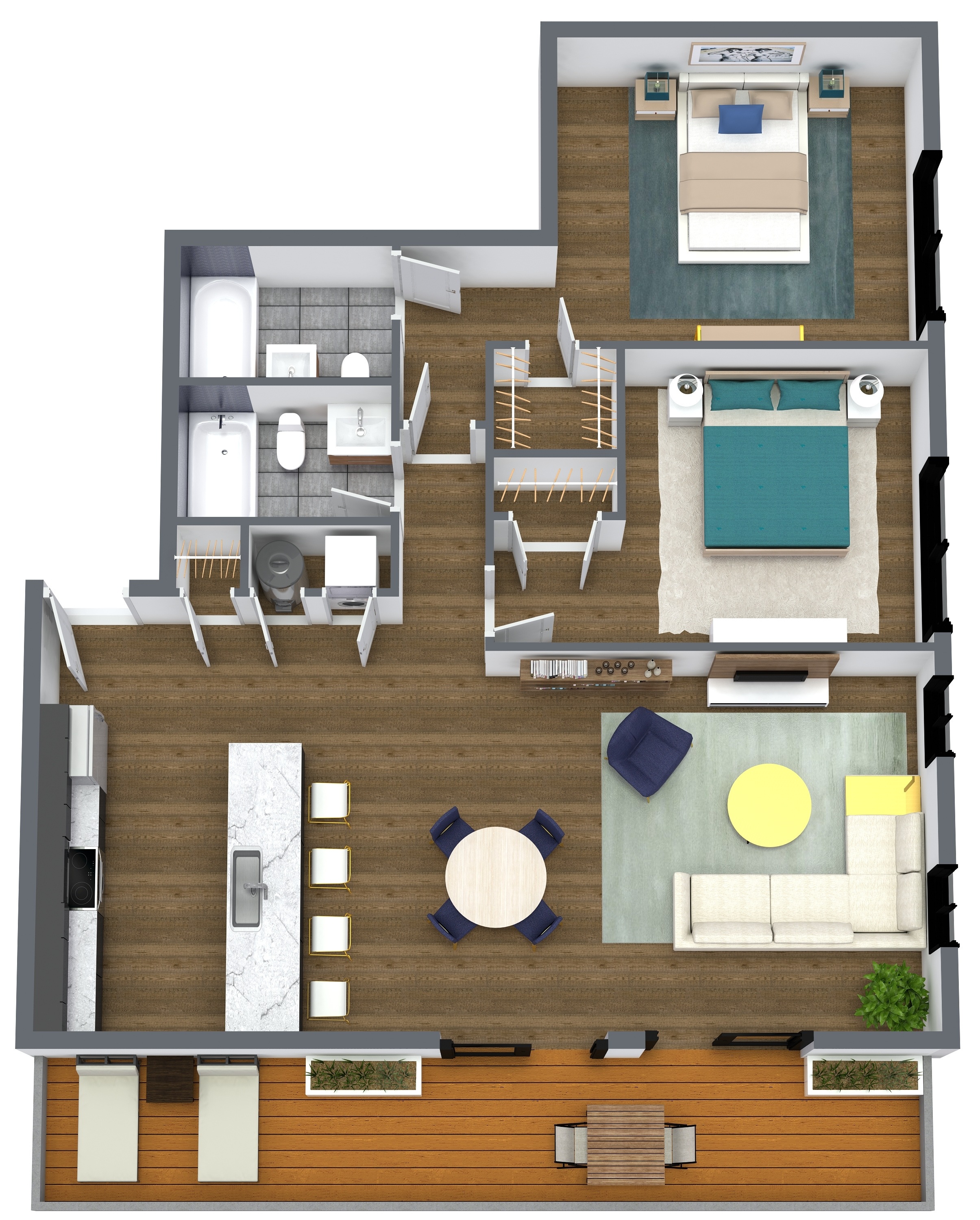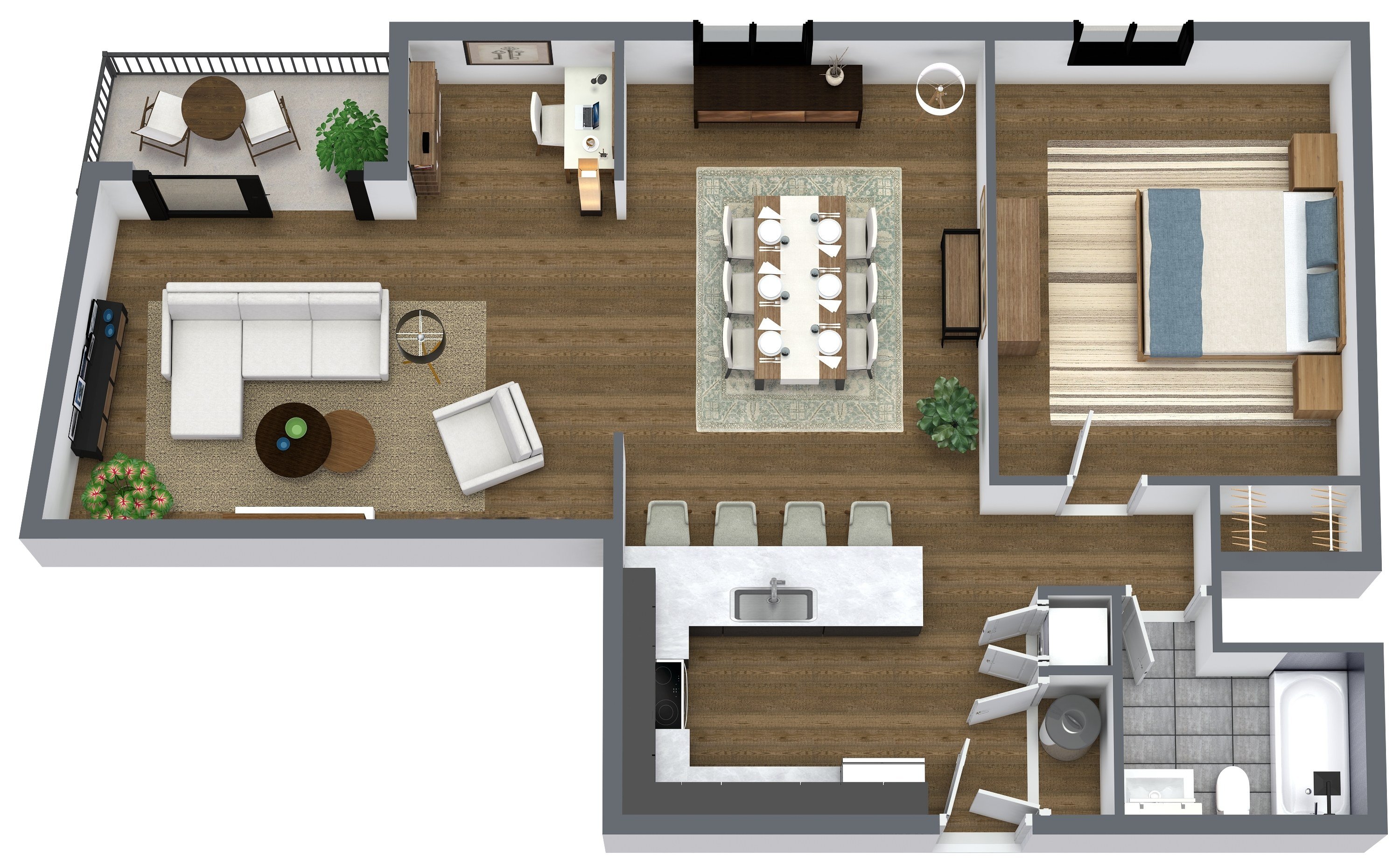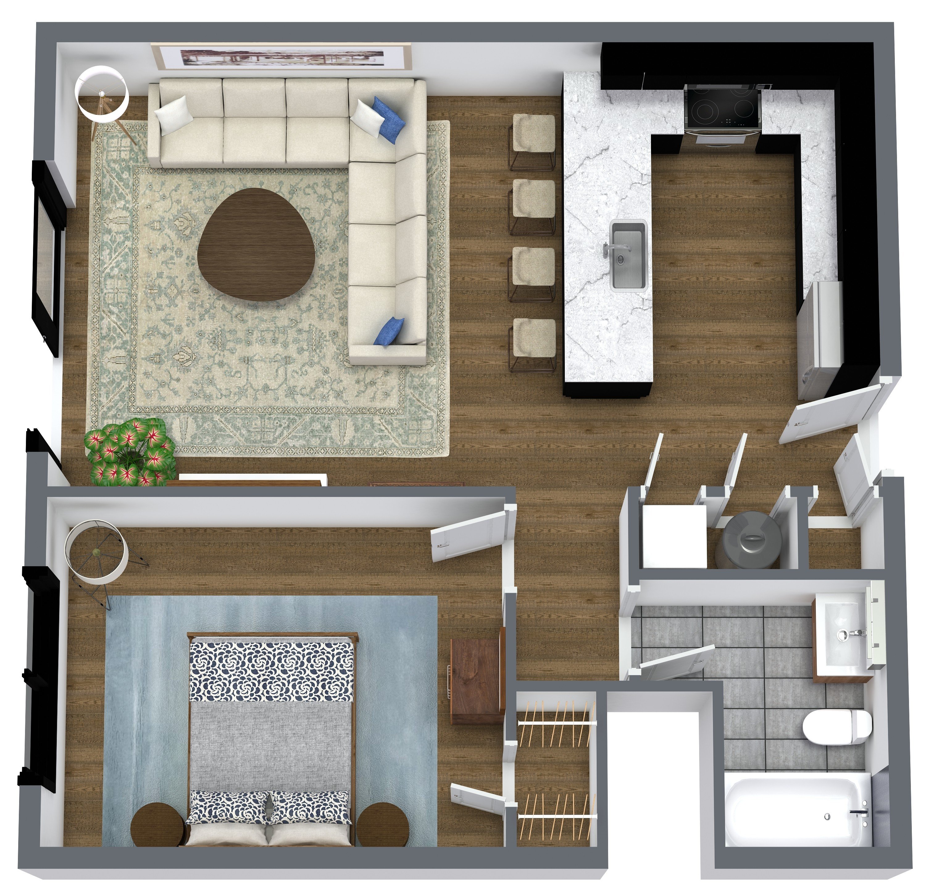 At Parkline, every amenity is designed to bring ease and connection to everyday life. Homes at Parkline feature in-unit washers and dryers, private balconies or terraces, and large windows that fill each space with natural light. Hardwood-style flooring, stainless steel appliances, and warm contemporary finishes create a clean, modern feel throughout. Each kitchen is equipped with a garbage disposal, custom tile and cabinetry, and recessed lighting for a polished look.